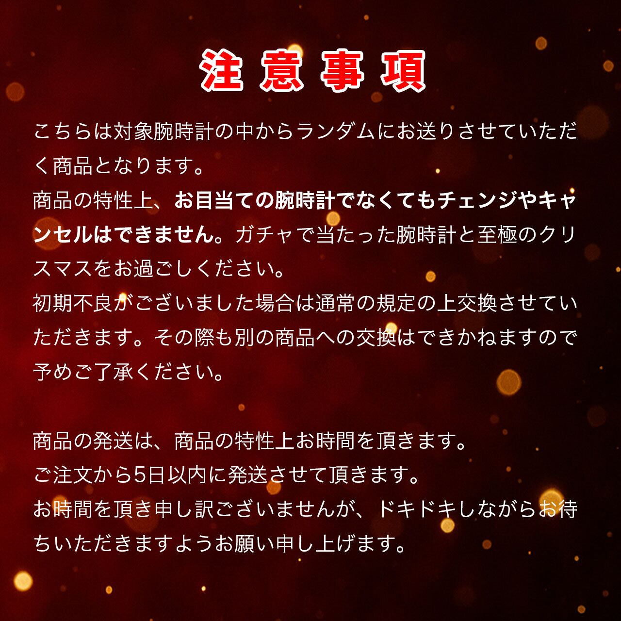 商品の特性上、お目当ての腕時計でなくてもチェンジやキャンセルはできません。ガチャで当たった腕時計と至極のクリスマスをお過ごしください。