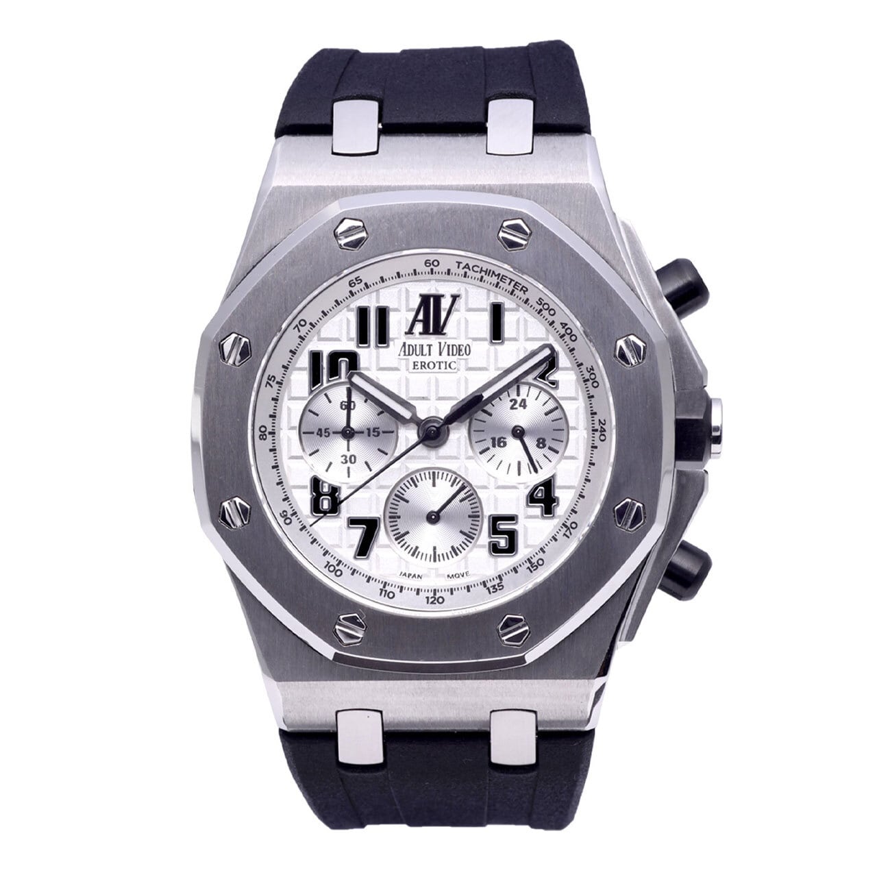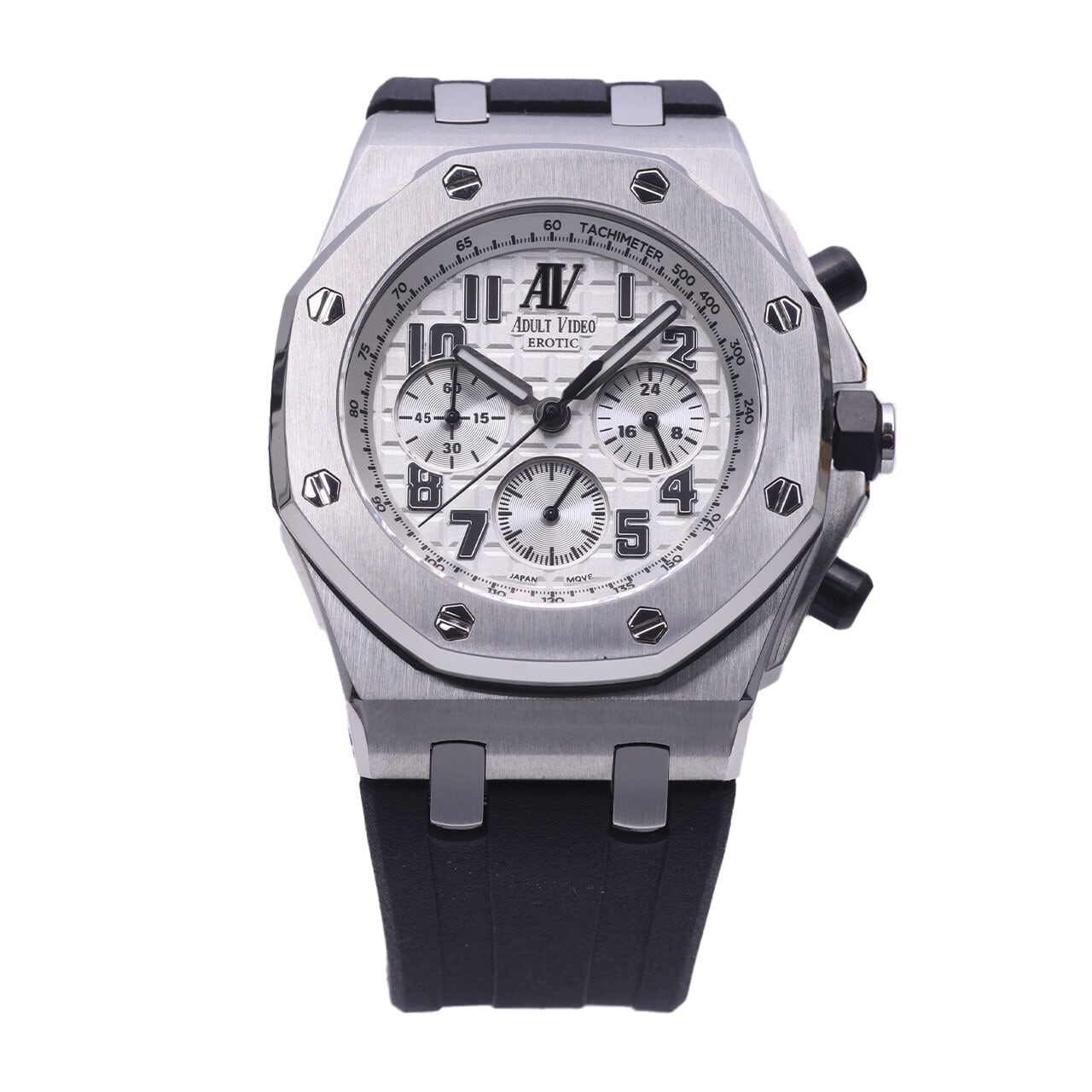 【レビュー特典付き】アダルトビデオ エロティック (シルバー×ホワイト) 日本製ムーブメント メンズ腕時計 男性用 クロノグラフ クォーツ時計