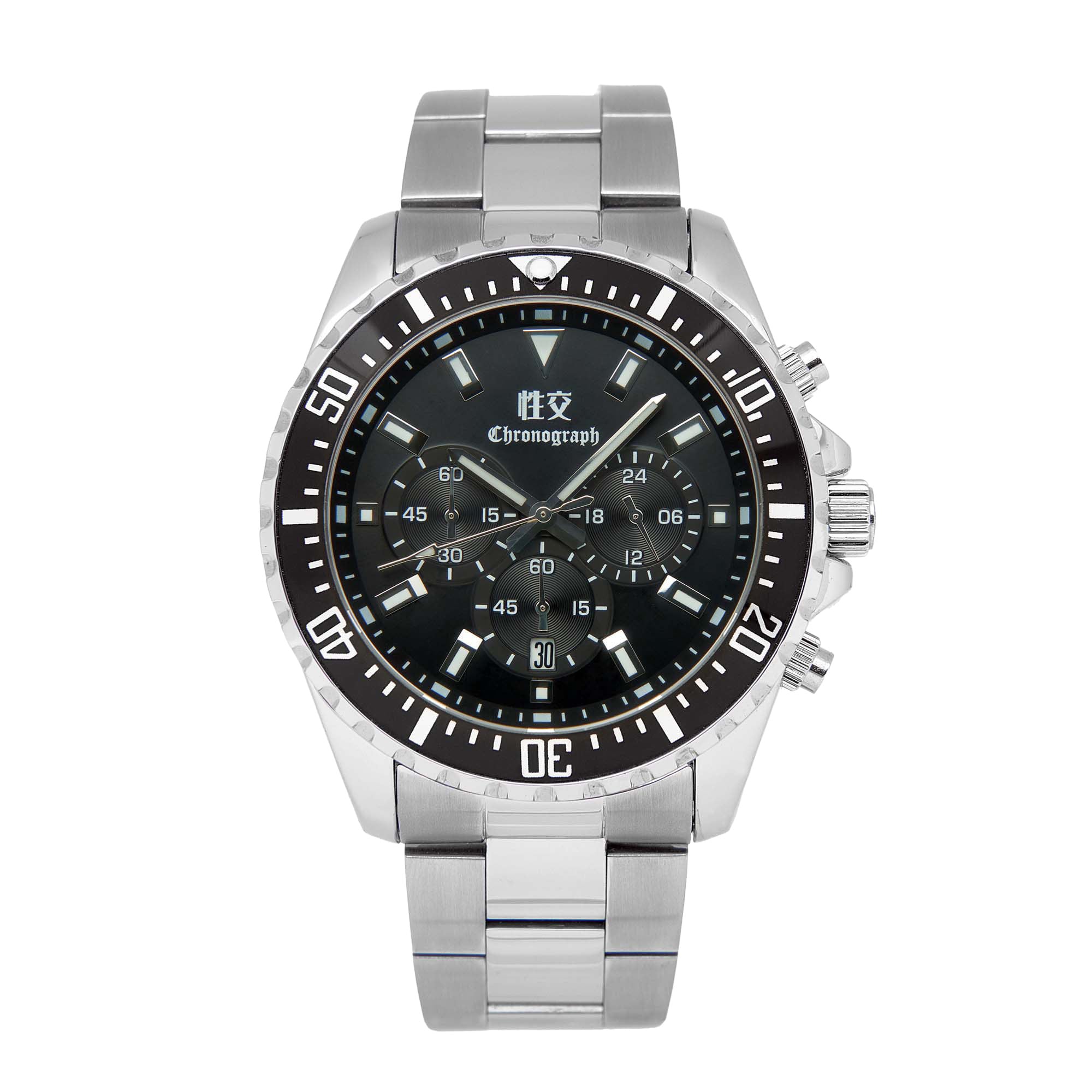 【新感覚のクロノグラフ風モデル】圧倒的な美しさを誇るクロノグラフ。しっかり日付機能も搭載!まさかのクロノグラフ秒針は「秒針」として機能するプレミアム仕様!さらに、時針はルミブライト仕様で闇夜の中の聖なる光(聖光)で濃厚接触タイムも丸わかり!